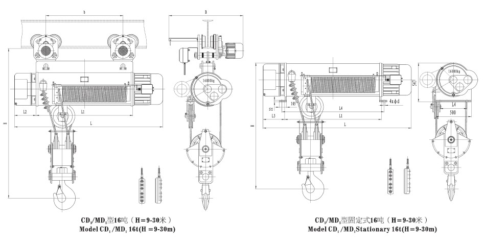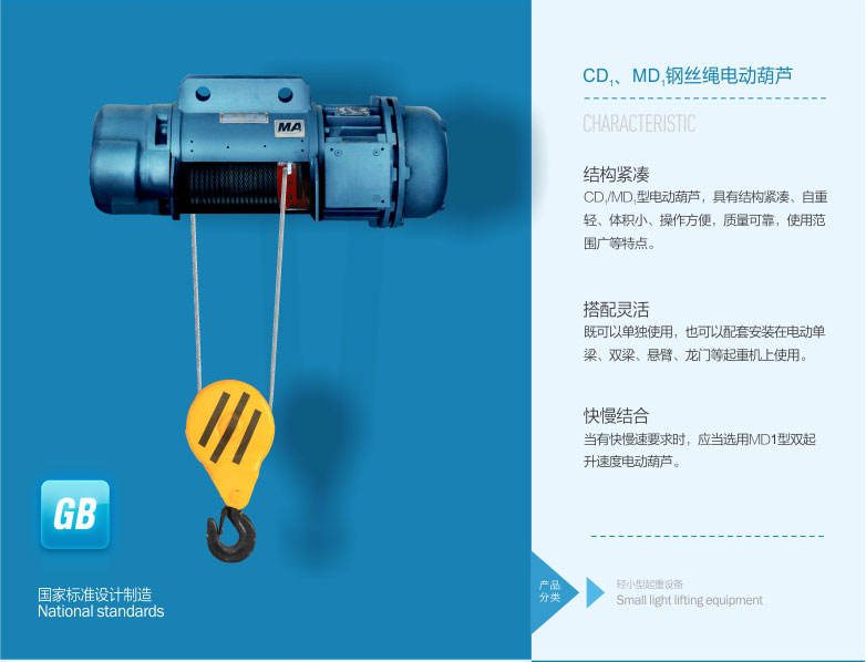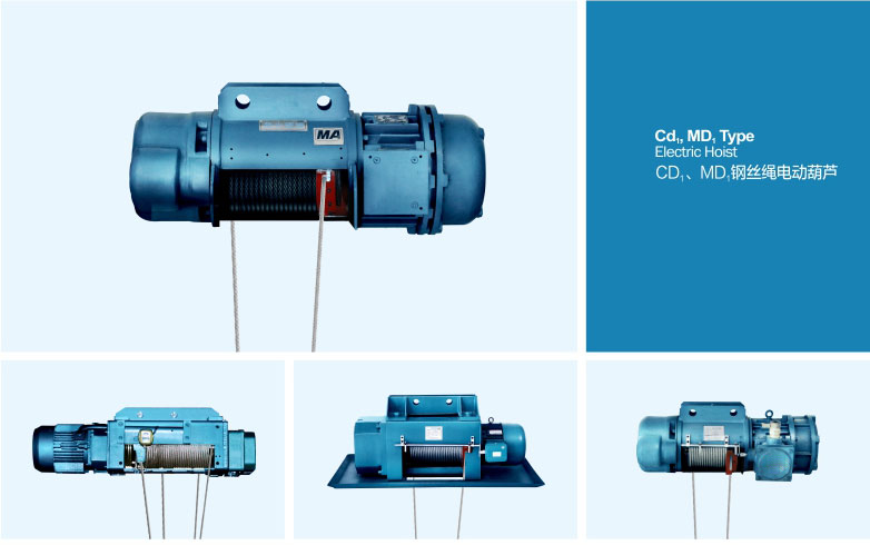 1、 CD1型、MD1型鋼絲繩電動葫蘆是一種輕小型起重設備,它可以安裝在葫蘆單梁、橋式起重機、門式起重機、懸臂起重機上。稍加改動,還可作卷揚用。