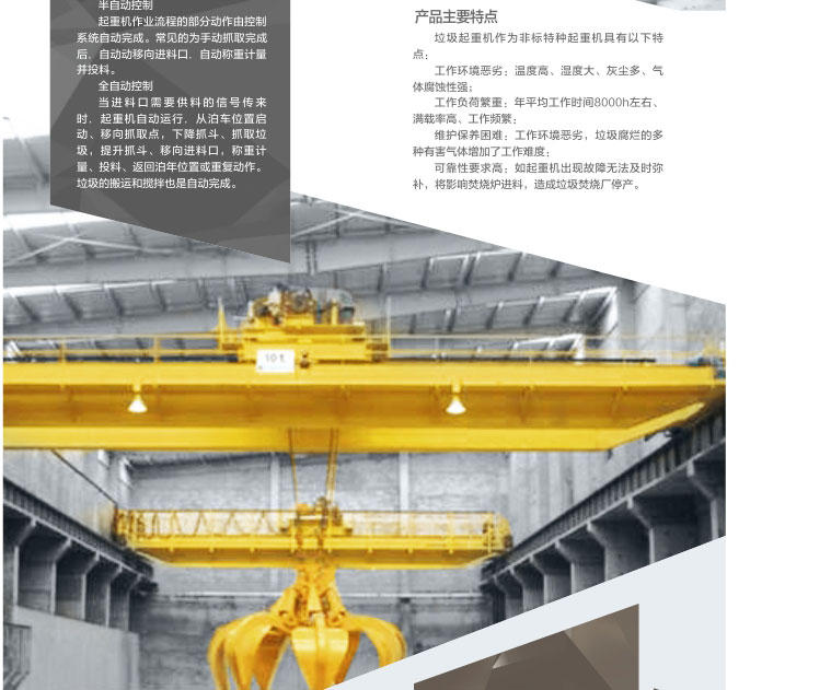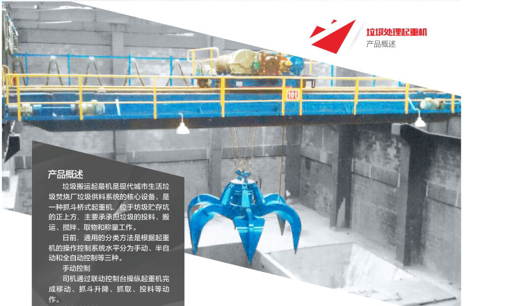 1、 垃圾抓斗起重機(jī)是現(xiàn)代城市各種垃圾焚燒發(fā)電廠垃圾供料系統(tǒng)的核心設(shè)備,位于垃圾儲存坑的上方,主要承擔(dān)對垃圾的投料、搬運(yùn)、攪拌、取物和稱重等作業(yè)。
