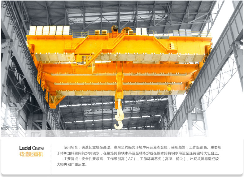 1、 鑄造起重機(jī)是煉鋼連鑄工藝中的主要設(shè)備。主要用于吊運和轉(zhuǎn)運液態(tài)鋼包。